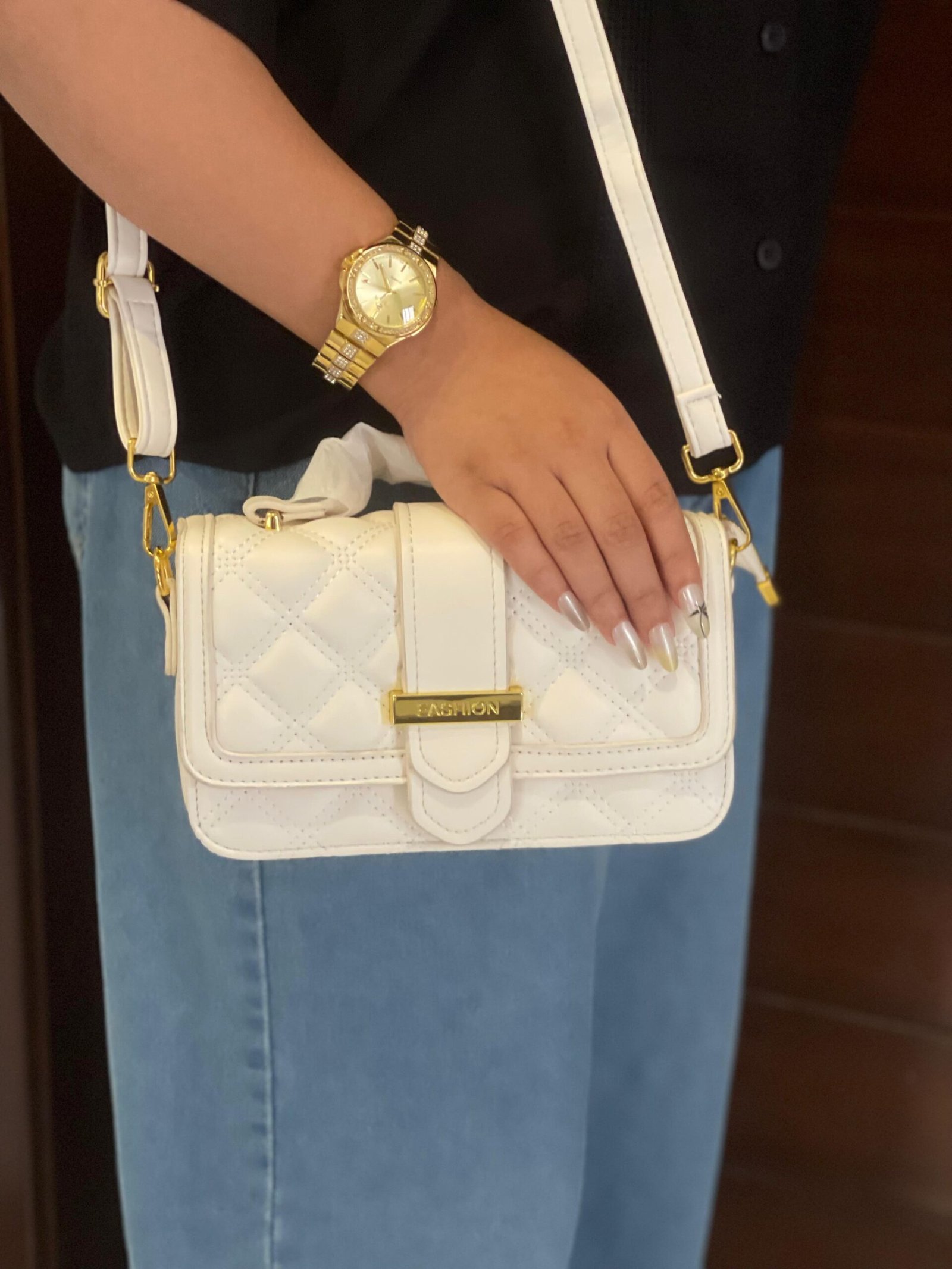 Designed with versatility in mind, it comes with two interchangeable straps — a classic leather strap for a polished daytime look and a gold chain strap for effortless evening glam. The magnetic flap closure keeps your essentials secure, while the top handle adds an extra dose of sophistication.