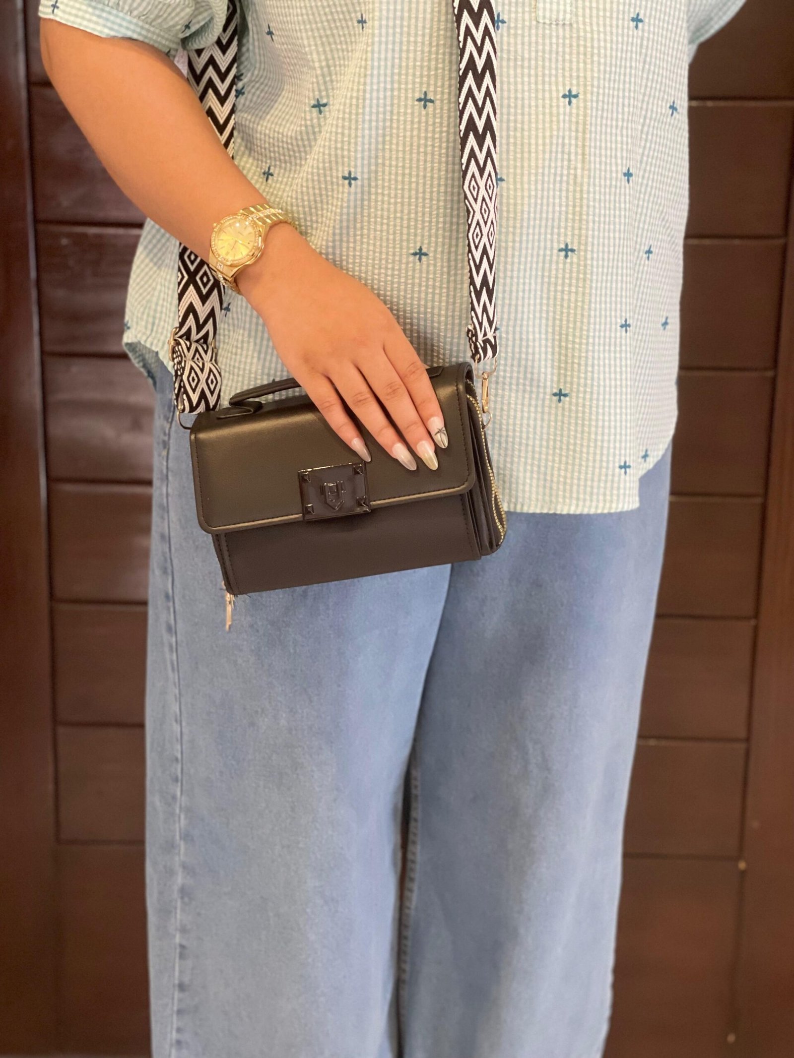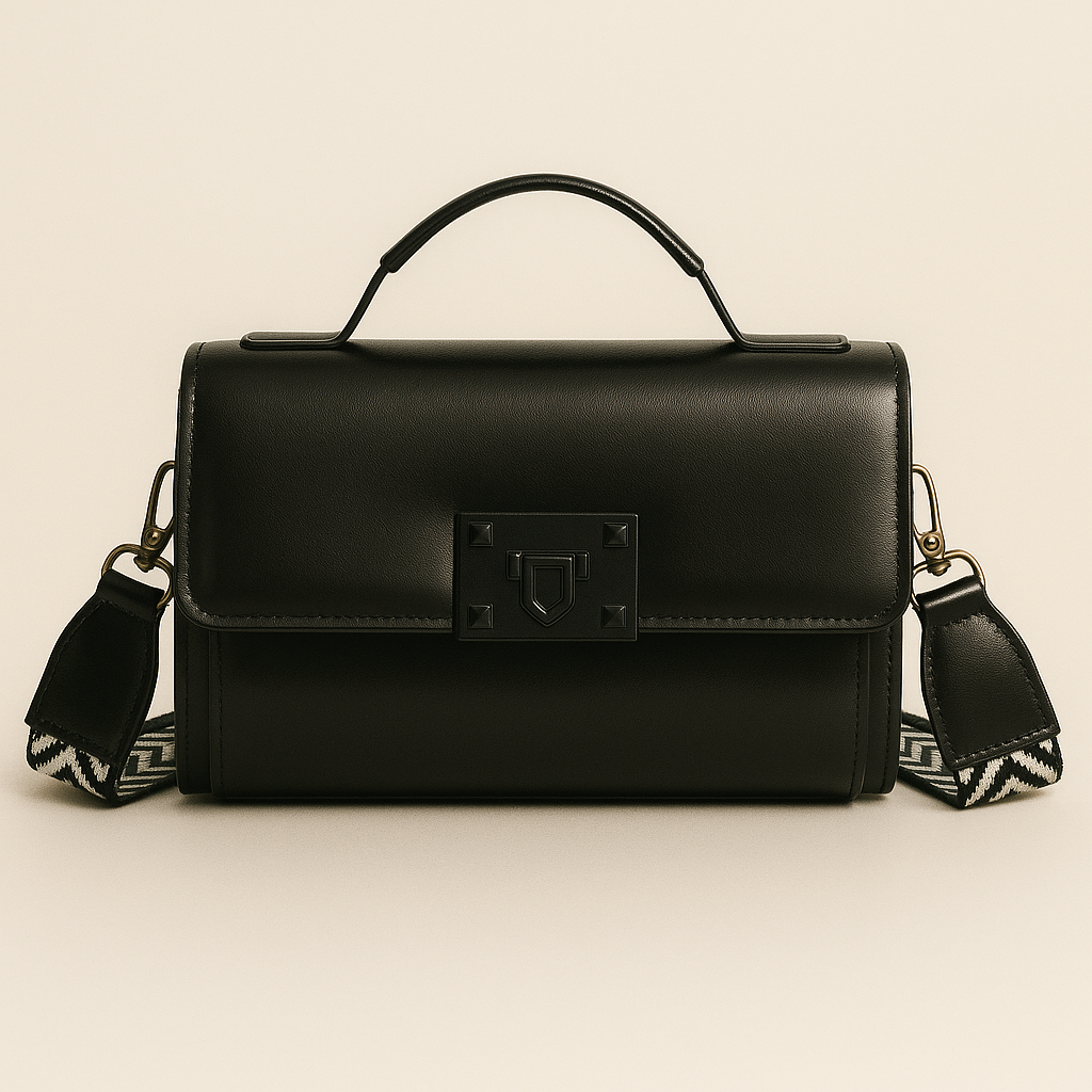 Chic, modern, and effortlessly versatile — this black crossbody bag is your perfect everyday companion. Made from premium vegan leather, it features a structured silhouette, a sturdy top handle, and a detachable patterned strap for easy styling from day to night.